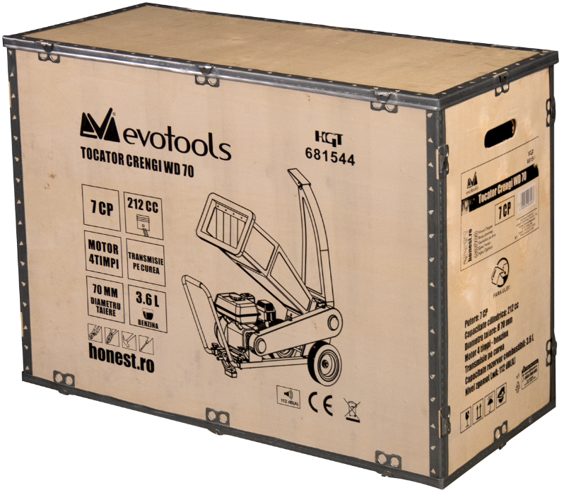Der Asthäcksler WD70 mit Riemenantrieb ist mit einem leistungsstarken, luftgekühlten 4‑Takt‑Motor ausgestattet, der 7 PS und 3600 U/min liefert, mit 212 cm³ Hubraum.