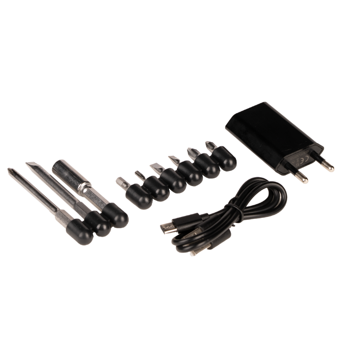 - Bits 25 mm: 1xPH1, 1xPH2, 1xSL4, 1xSL5, 1xT10, 1xH4)