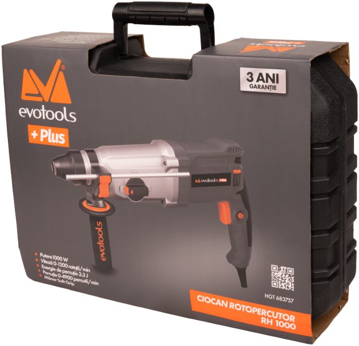 Der Bohrhammer RH 1000 EvoTools +Plus® ist ein robustes und zuverlässiges Gerät, das für die anspruchsvollsten Bohrarbeiten ausgelegt ist. Mit einem leistungsstarken 1000W-Motor und einer Schlagenergie von 3.3 J ist dieser Bohrhammer ideal für schnelles, effizientes Bohren in Beton, Stahl und Holz sowie für Meißelarbeiten. Das SDS-Plus-Aufnahmesystem ermöglicht einen schnellen Wechsel des Zubehörs, und das mitgelieferte Zubehörset macht ihn zu einer Komplettlösung für jede Baustelle oder Renovierung.