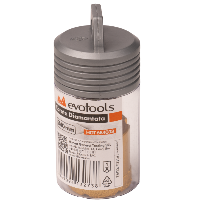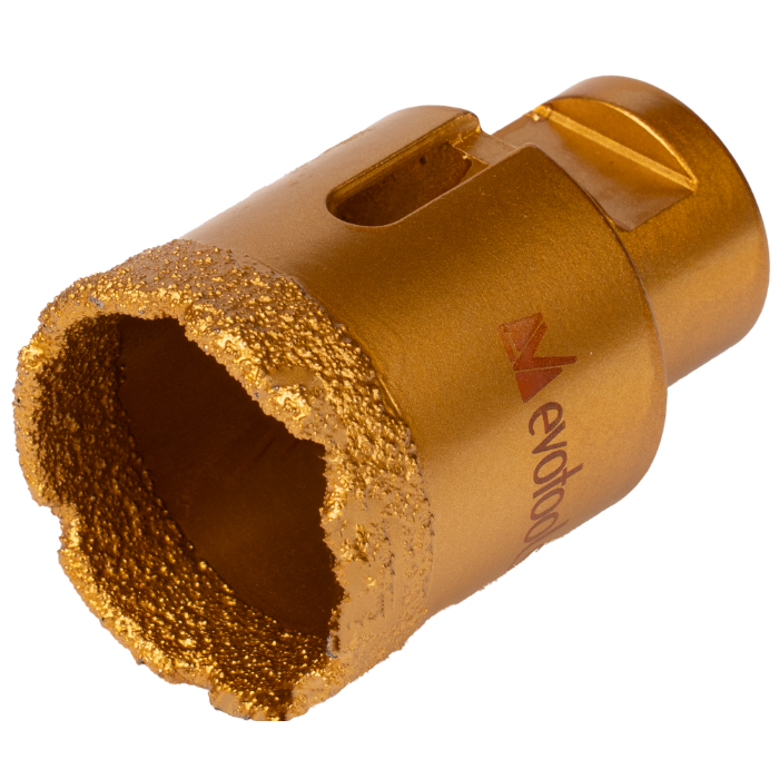 Die EvoTools® Diamantbohrkrone ist ein Werkzeug für präzises Bohren und bietet die Vielseitigkeit, sowohl nass als auch trocken eingesetzt zu werden. Das goldene Design und die robuste Konstruktion aus 45#-Stahl mit Nickelbeschichtung gewährleisten eine hohe Widerstandsfähigkeit im Einsatz.