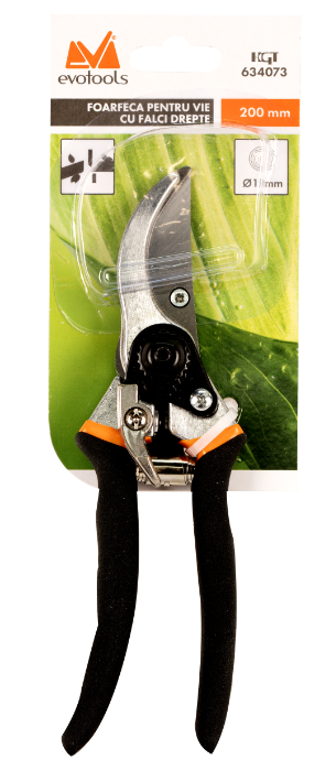 Die EvoTools® Rebschere besitzt Schneidbacken aus hochwertigem, wärmebehandeltem Kohlenstoffstahl mit einer Härte von 48-52 HRC sowie eine Einstellmutter zur Regulierung der Klemmkraft. Die ergonomischen Griffe aus Aluminium mit PVC-Beschichtung und die vorgespannte Feder ermöglichen optimalen Halt, reduzieren das Abrutschen und erleichtern die Bedienung, sodass sich Äste bis zu 15 mm Durchmesser leicht schneiden lassen. Dieser Scherentyp ist für Gartenpflegearbeiten oder Rebschnitt konzipiert.