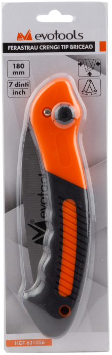 Die klappbare Astsäge EvoTools® hat ein Blatt aus wärmebehandeltem 65 Mn-Stahl, der zweikomponentige Griff besteht aus Polypropylen und thermoplastischem Gummi (TPR). Das Blatt ist 180 mm lang und besitzt eine Zahndichte mit 2 Schneidkanten von 7 Zähnen/25.4 mm. Der ergonomische Griff reduziert Ermüdung und Abrutschen dank der gummierten Zonen und ermöglicht lange Einsatzzeiten. Dank des Klappmechanismus kann diese Säge sicher transportiert werden, ohne Verletzungsrisiko. Am Griff befindet sich eine Taste, die das Blatt sowohl während der Nutzung fixiert, damit es sich nicht schließt, als auch im geschlossenen Zustand, damit es sich nicht öffnet. Nur zum Schneiden von Holz verwenden.
