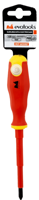 Dieser EvoTools® Schraubendrehertyp hat einen Arbeitsbereich aus hochwertigem, wärmebehandeltem Cr-V-Stahl und ist mit einer isolierenden Polypropylen-Schicht überzogen. Die magnetische Spitze sorgt für einen guten Halt der Schraube, wodurch das Risiko verringert wird, dass die Schraube in schwer zugängliche Bereiche gelangt, und senkt das Risiko elektrischer Unfälle. Der aus hochwertigem Polypropylen gefertigte Griff bietet optimalen Halt und Komfort bei der Anwendung. Der Schraubendreher wird gemäß der europäischen Norm EN 60900 (VDE) gefertigt und bietet elektrischen Schutz bis 1000 V (1 KV).