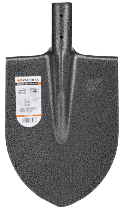 Dieser Spaten-Typ hat ein Blatt aus hochwertigem Kohlenstoffstahl Mn 65, wärmebehandelt, im Warmpressverfahren gefertigt und durch elektrostatische Lackierung geschützt, was hohe Härte im Einsatz und Widerstand gegen mechanische Stöße gewährleistet. Die gerollte Tülle ist konisch für eine gute Verbindung mit dem Stiel; die Verbindung erfolgt durch Stanzen. Wird für landwirtschaftliche Arbeiten, Erdarbeiten usw. verwendet.