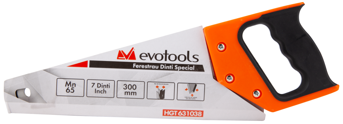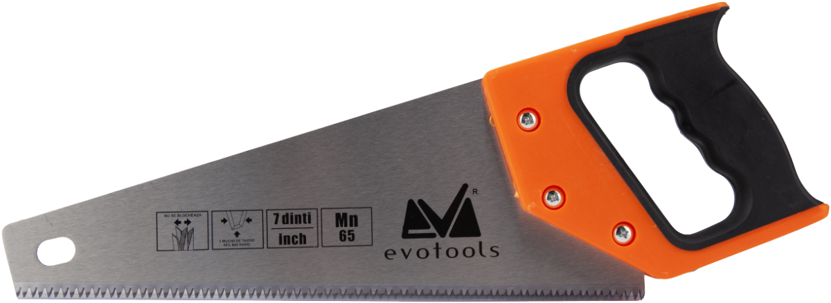 Dieser EvoTools®-Sägentyp hat ein Blatt aus wärmebehandeltem Mn65-Stahl, der zweikomponentige Griff besteht aus Polypropylen und thermoplastischem Gummi (PP + TPR). Das Blatt hat eine Zahndichte von 7 Zähnen mit 3 Schneidkanten / 2.54 cm. Nur zum Schneiden von Holz verwenden.