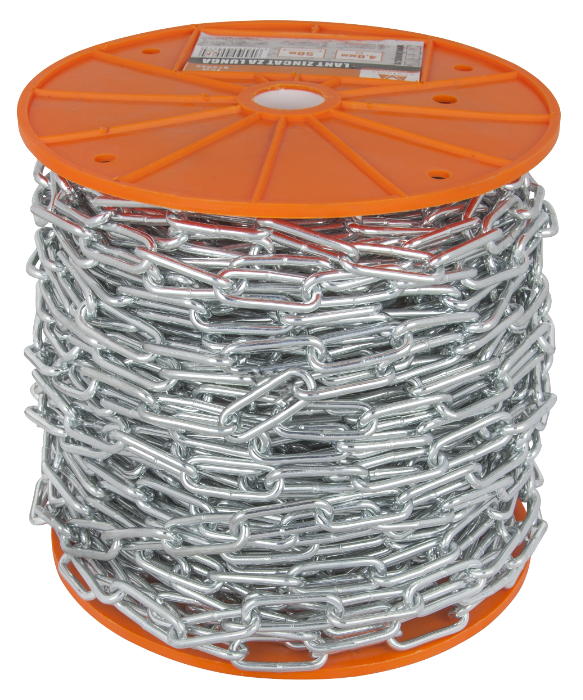 Die verzinkte Handelskette mit kurzem Glied unterliegt keinen Festigkeitsprüfungen und darf nicht als Lastaufnahmekette verwendet werden (Heben, Ziehen ή dauerhafte Lasten).