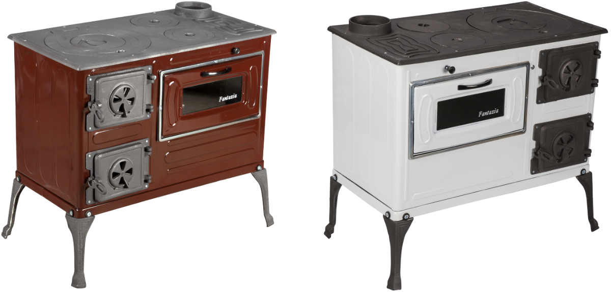 Dies ist ein Festbrennstoffofen, der sowohl zum Heizen von Wohnräumen als auch zum Kochen verwendet werden kann (mit Kochplatte und Backofen ausgestattet). Der Ofen besteht aus emailliertem Stahl, ist innen mit Schamotte ausgekleidet und besitzt eine gusseiserne Kochplatte mit 3 Ringen sowie einen Backofen (links oder rechts).