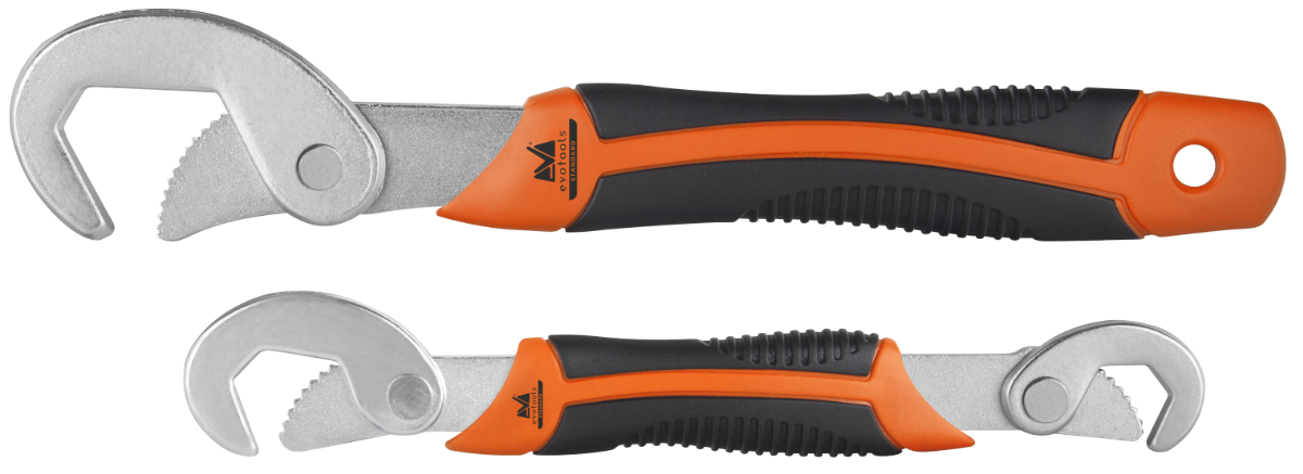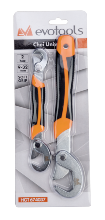 Der universelle Schlüssel EvoTools® ist aus hochwertigem Kohlenstoffstahl gefertigt und wärmebehandelt. Die verchromte Oberfläche schützt den Schlüssel vor Kratzern und verleiht ihm ein ansprechendes Aussehen. Der ergonomische Griff aus PVC bietet einen optimalen Halt bei der Verwendung und minimiert das Risiko des Abrutschens. Der kleine Schlüssel kann für Größen von 9-22 mm verwendet werden, der große Schlüssel für Größen von 23-32 mm.