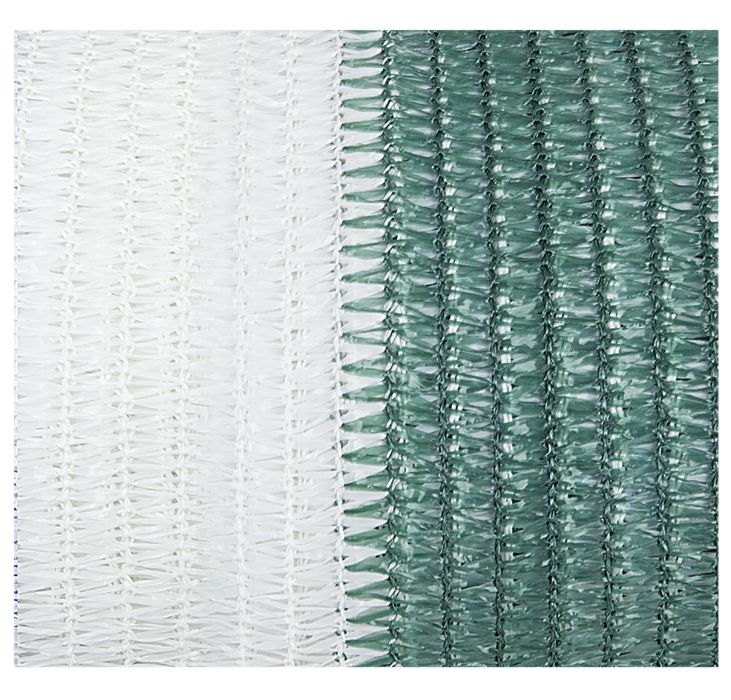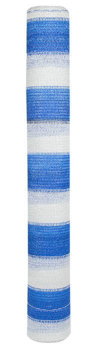 Schattierungsnetz in Weiß-Blau und Weiß-Grün aus HDPE (hochdichtes Polyethylen) mit verstärkter Kante über die gesamte Länge und verstärkten Ösen im Abstand von 10 cm entlang der gesamten Länge für eine einfache und langlebige Montage.