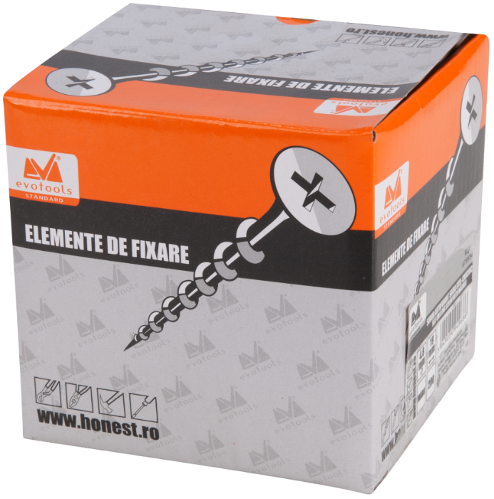 Dieser Schraubentyp wird zur Befestigung von Metallblechen auf einer Holzkonstruktion für Dächer verwendet. Er wird durch Kaltumformung aus C1022-Stahl gefertigt, weiß verzinkt, und ist mit einer Stahlscheibe und EPDM-Gummidichtung ausgestattet, um Wassereindringung zu verhindern. Der Kopf ist sechskantig 8 mm für bestmöglichen Halt mit passenden Schlüsseln.